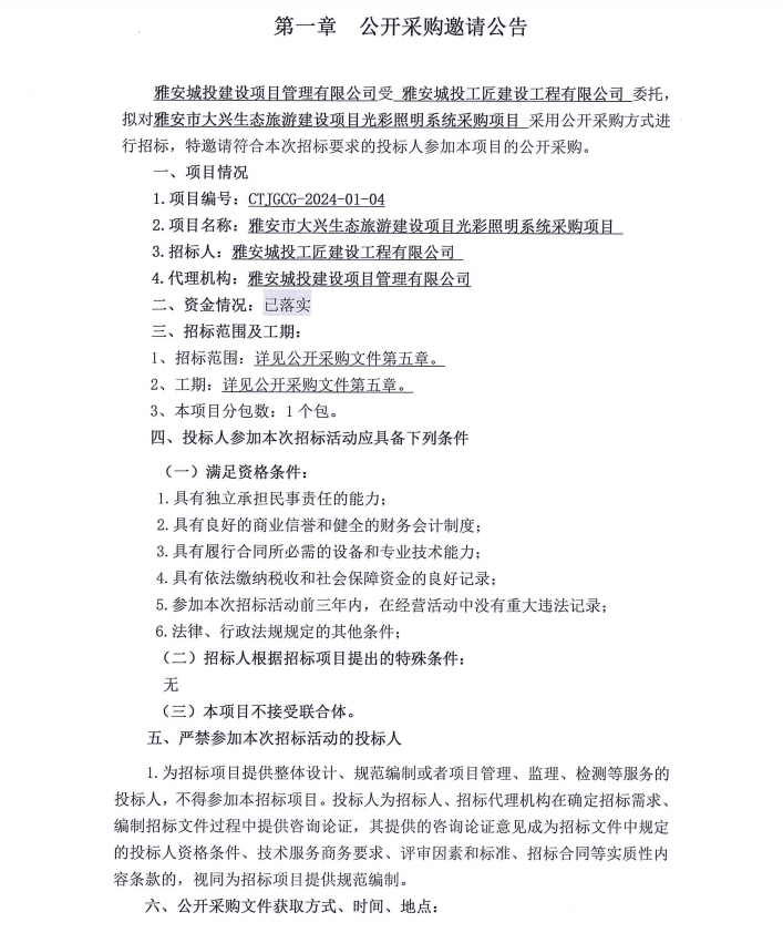 雅安市大興生態(tài)旅游建設(shè)項(xiàng)目光彩照明系統(tǒng)采購(gòu)項(xiàng)目公開(kāi)采購(gòu)邀請(qǐng)公告