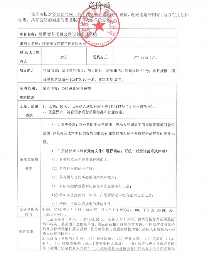 蒙頂壹號項目公區(qū)設備家具采購競價公告