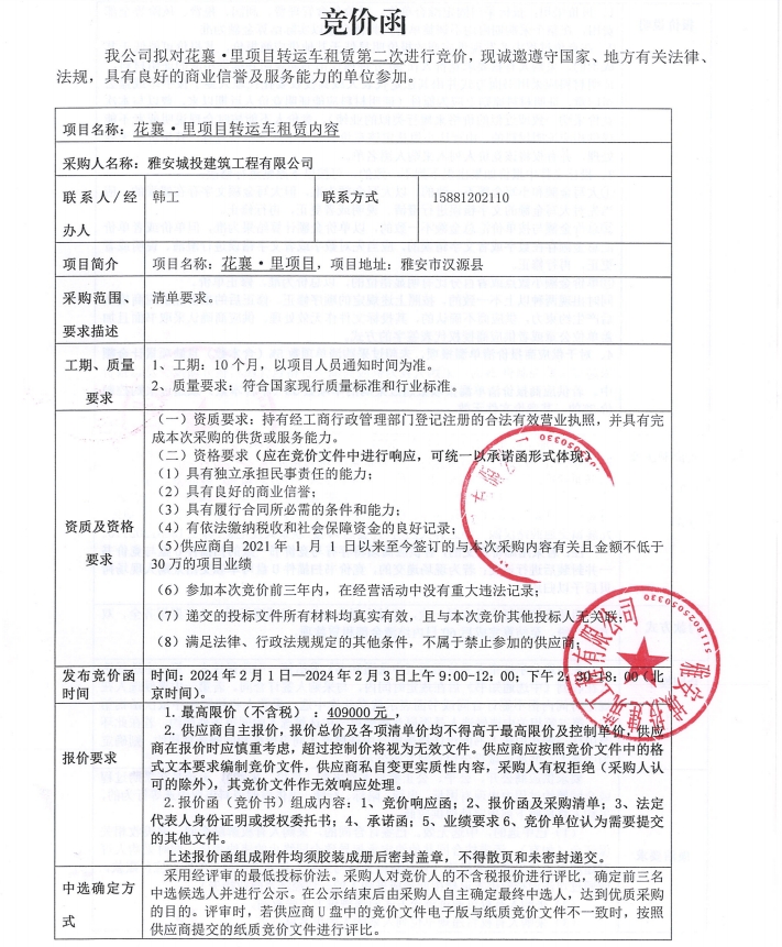 花襄·里項目轉(zhuǎn)運(yùn)車租賃(第二次)競價公告