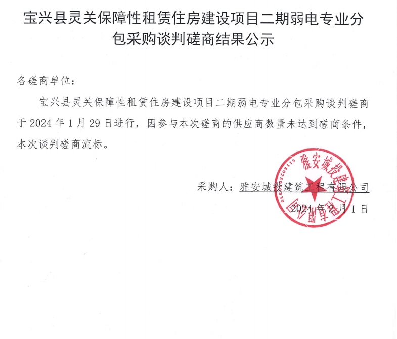 寶興縣靈關(guān)保障性租賃住房建設(shè)項(xiàng)目二期弱電專(zhuān)業(yè)分包采購(gòu)談判磋商結(jié)果公示