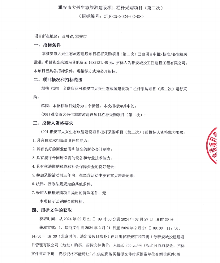 雅安市大興生態(tài)旅游建設(shè)項(xiàng)目欄桿采購項(xiàng)目(第二次)公告