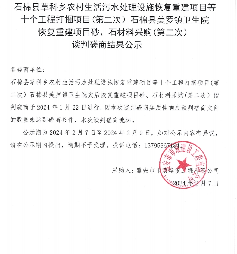 石棉縣草科鄉(xiāng)農村生活污水處理設施恢復重建項目等十個工程打捆項目(第二次)石棉縣美羅鎮(zhèn)衛(wèi)生院恢復重建項目砂、石材料采購(第二次)談判磋商結果公示