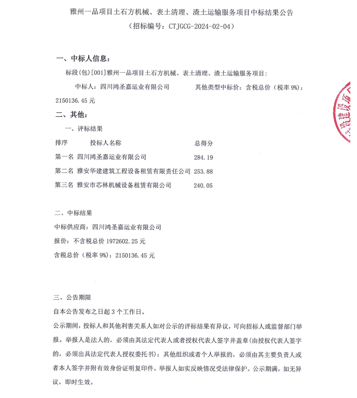 雅州一品項(xiàng)目土石方機(jī)械、表土清理、渣土運(yùn)輸服務(wù)項(xiàng)目中標(biāo)結(jié)果公告