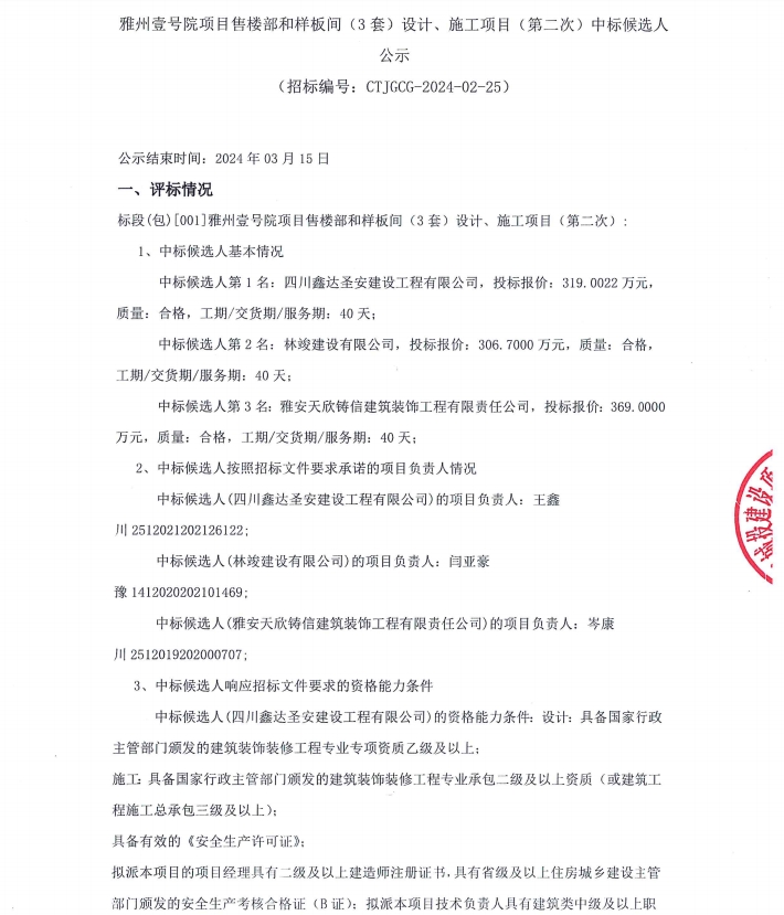 雅州壹號(hào)院項(xiàng)目售樓部和樣板間(3套)設(shè)計(jì)、施工項(xiàng)目(第二次)中標(biāo)候選人公示