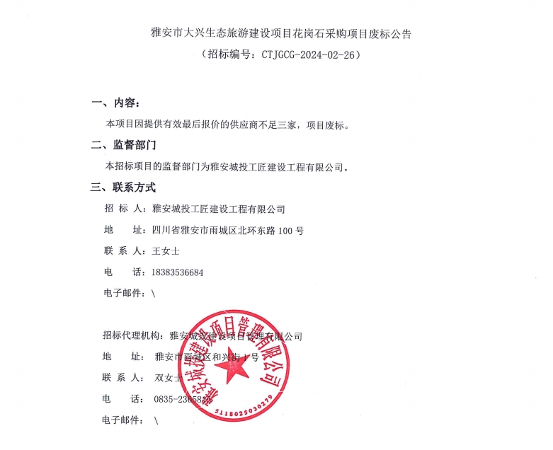 雅安市大興生態(tài)旅游建設(shè)項(xiàng)目花崗石采購項(xiàng)目廢標(biāo)公告