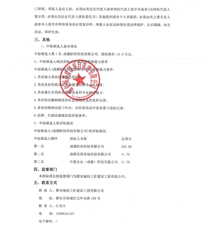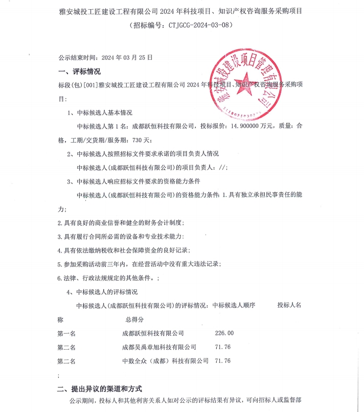 雅安城投工匠建設(shè)工程有限公司2024年科技項目、知識產(chǎn)權(quán)咨詢服務(wù)采購項目公示