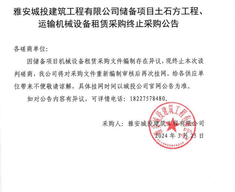 雅安城投建筑工程有限公司儲(chǔ)備項(xiàng)目土石工程、運(yùn)輸機(jī)械設(shè)備租賃采購終止采購公告