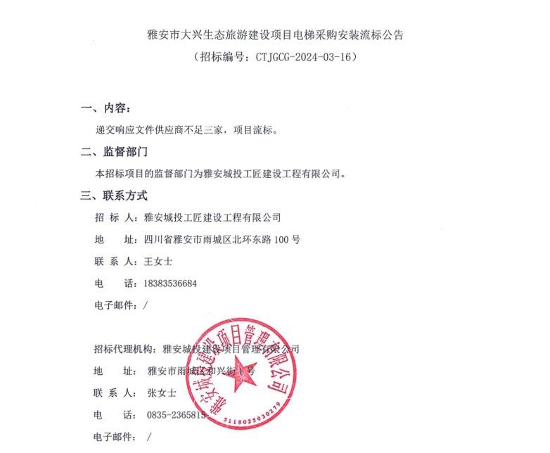 雅安市大興生態(tài)旅游建設項目電梯采購安裝流標公告
