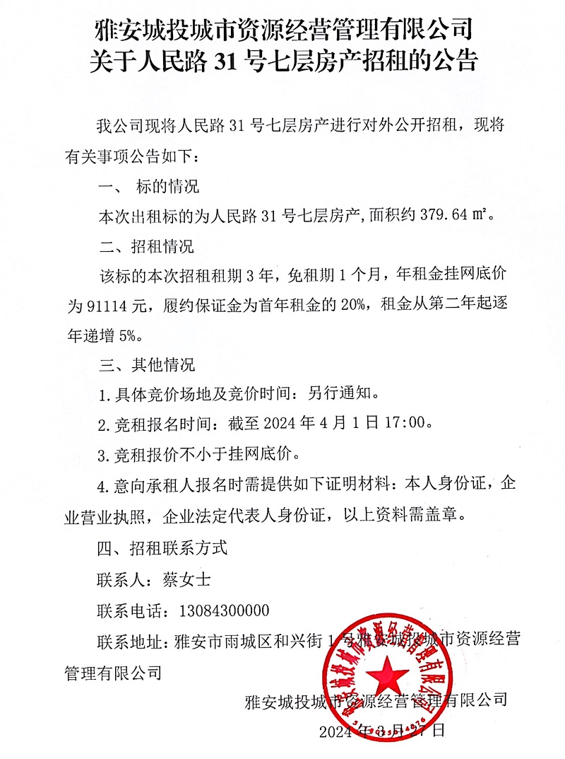 雅安城投城市資源經(jīng)營管理有限公司關(guān)于人民路31號(hào)七層房產(chǎn)招租的公告