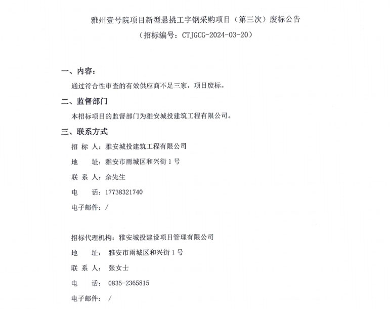 雅州壹號院項目新型懸挑工字鋼采購項目(第三次)廢標公告