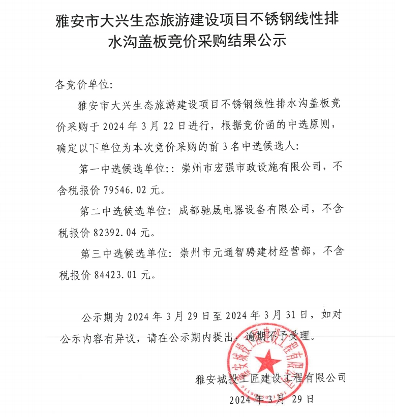雅安市大興生態(tài)旅游建設項目不銹鋼線性排水溝蓋板競價采購結(jié)果公示