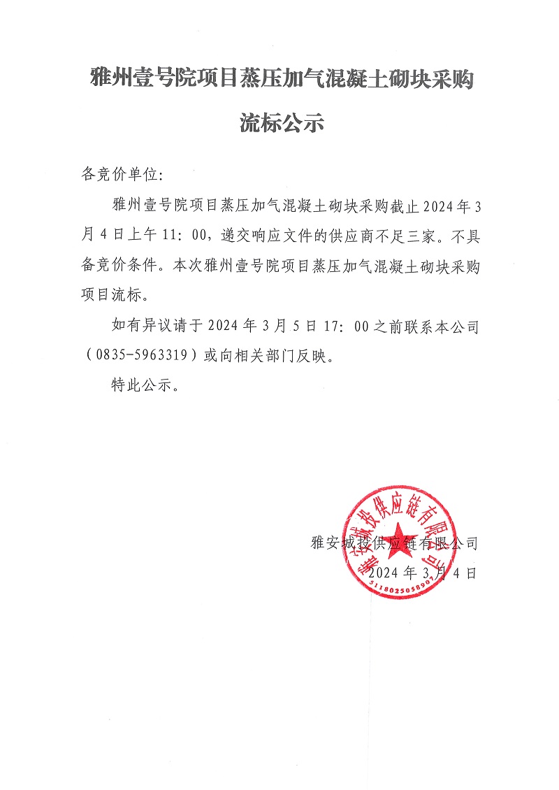 雅州壹號院項目蒸壓加氣混凝土砌塊采購流標公示