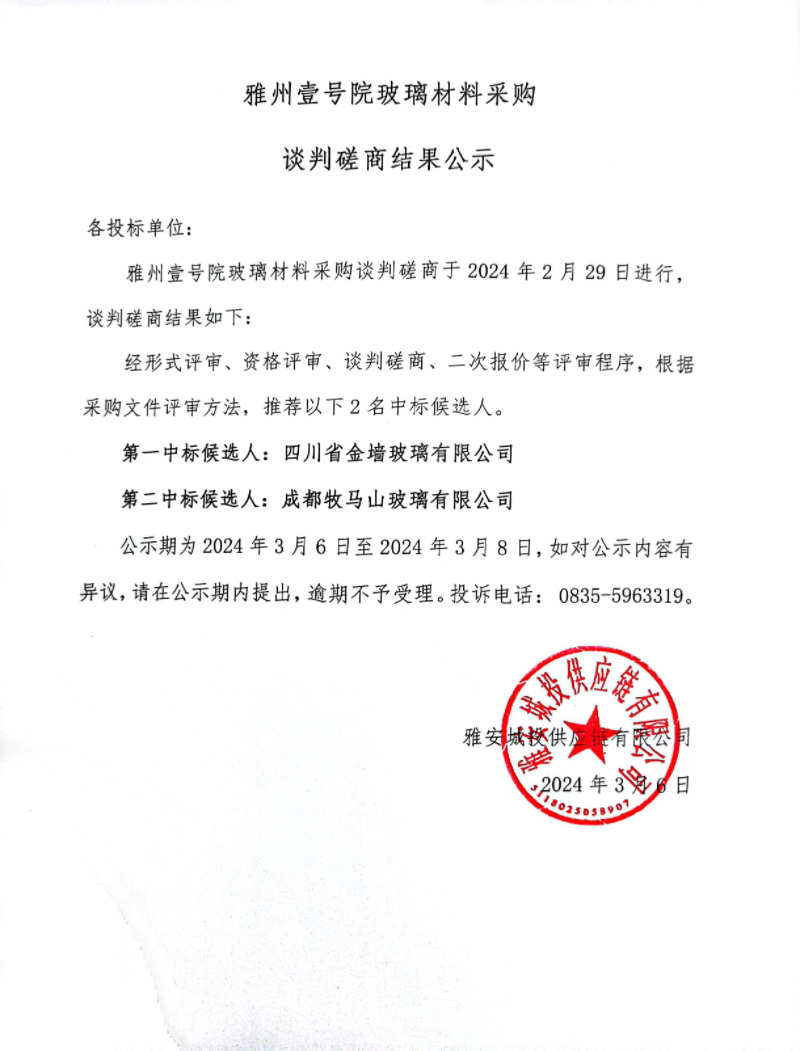 雅州壹號院玻璃材料采購談判磋商結(jié)果公示