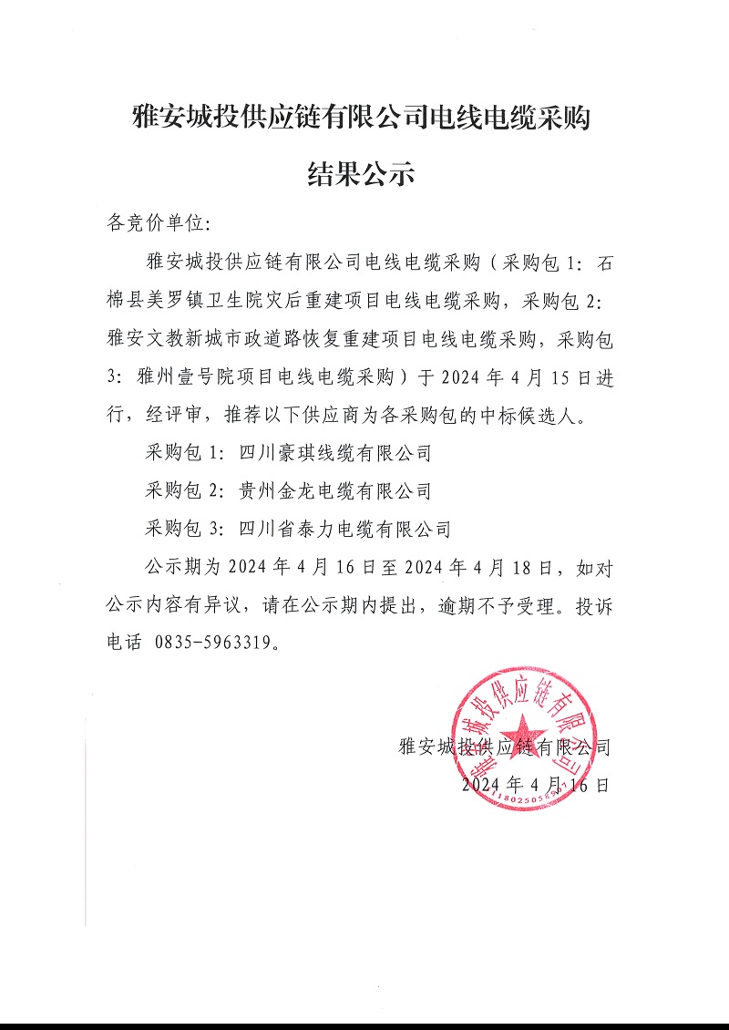 雅安城投供應(yīng)鏈有限公司電線電纜采購(gòu)結(jié)果公示