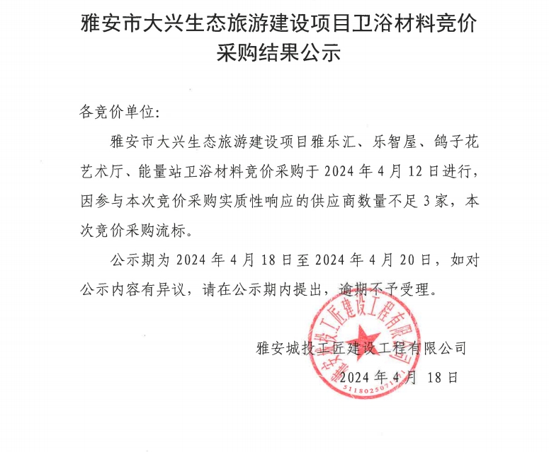 雅安市大興生態(tài)旅游建設(shè)項(xiàng)目衛(wèi)浴材料競(jìng)價(jià)采購(gòu)結(jié)果公示