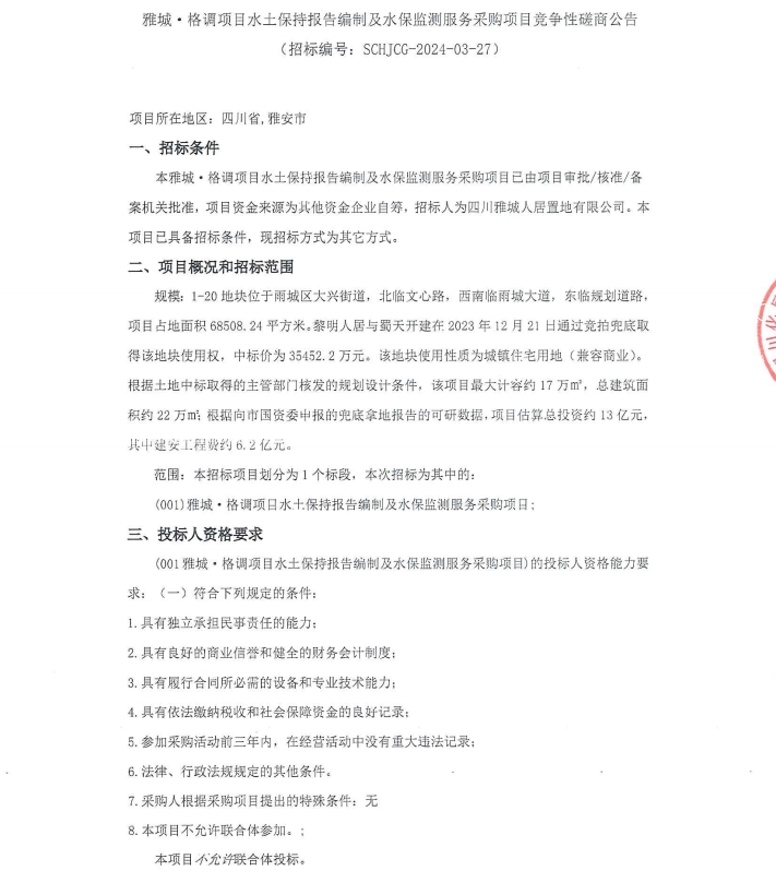 雅城·格調(diào)項(xiàng)目水土保持報(bào)告編制及水保監(jiān)測(cè)服務(wù)采購(gòu)項(xiàng)目競(jìng)爭(zhēng)性磋商公告