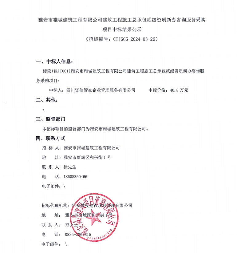 雅安市雅城建筑工程有限公司建筑工程施工總承包貳級資質新辦咨詢服務采購項目中標結果公示