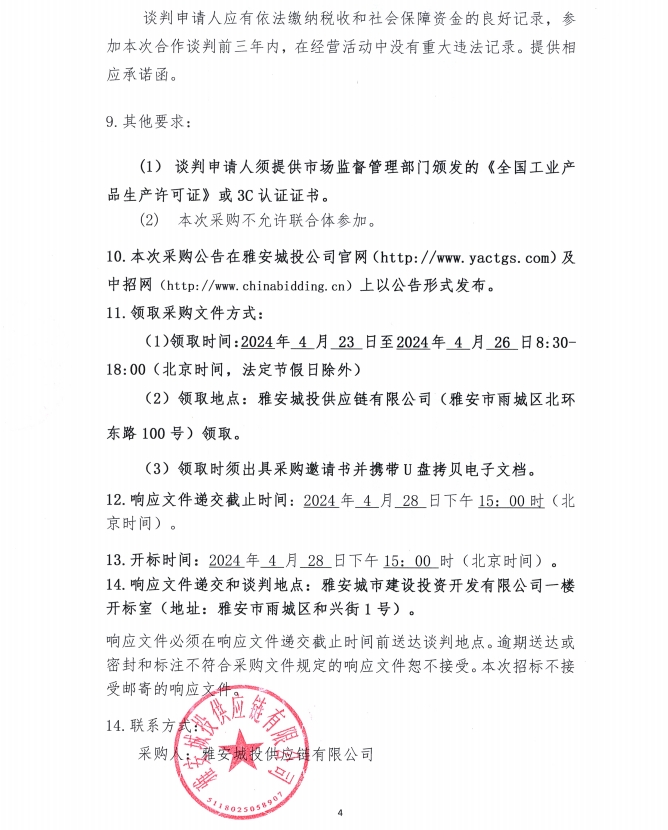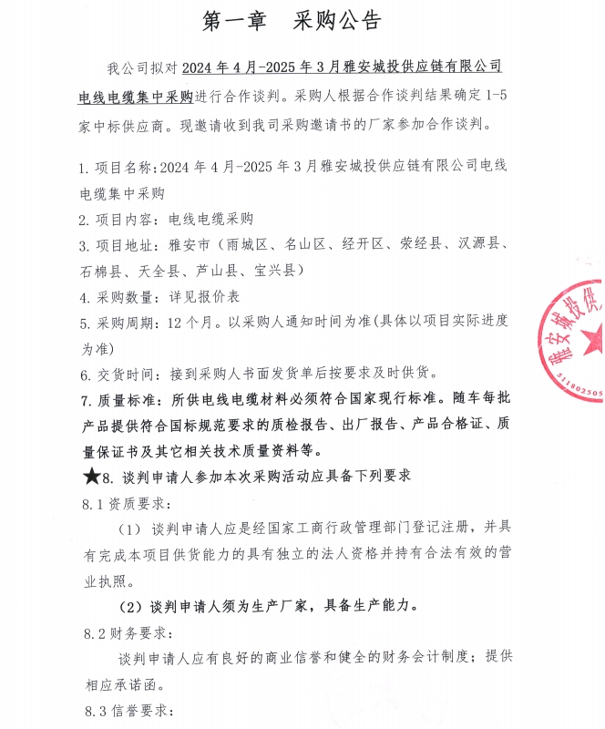 2024年4月-2025年3月雅安城投供應(yīng)鏈有限公司電線電纜集中采購公告