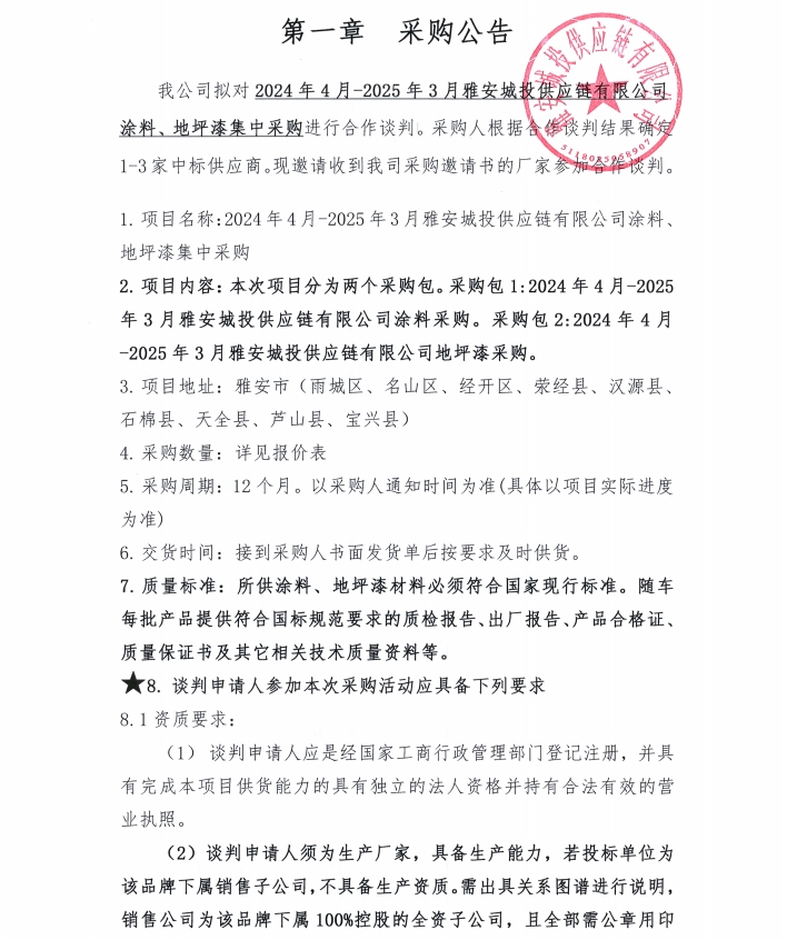 2024年4月-2025年3月雅安城投供應(yīng)鏈有限公司涂料、地坪漆集中采購公告
