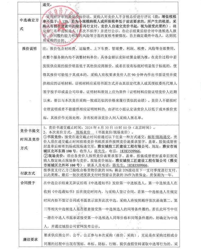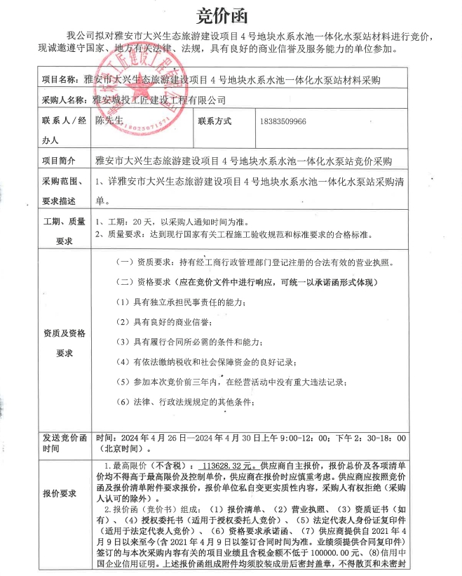 雅安市大興生態(tài)旅游建設(shè)項(xiàng)目4號(hào)地塊水系水池一體化水泵站材料采購競(jìng)價(jià)公告