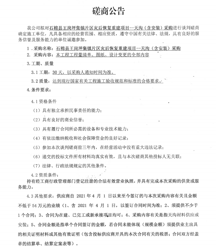 石棉縣王崗坪集鎮(zhèn)片區(qū)災(zāi)后恢復(fù)重建項目--天溝(含安裝)采購談判磋商公告