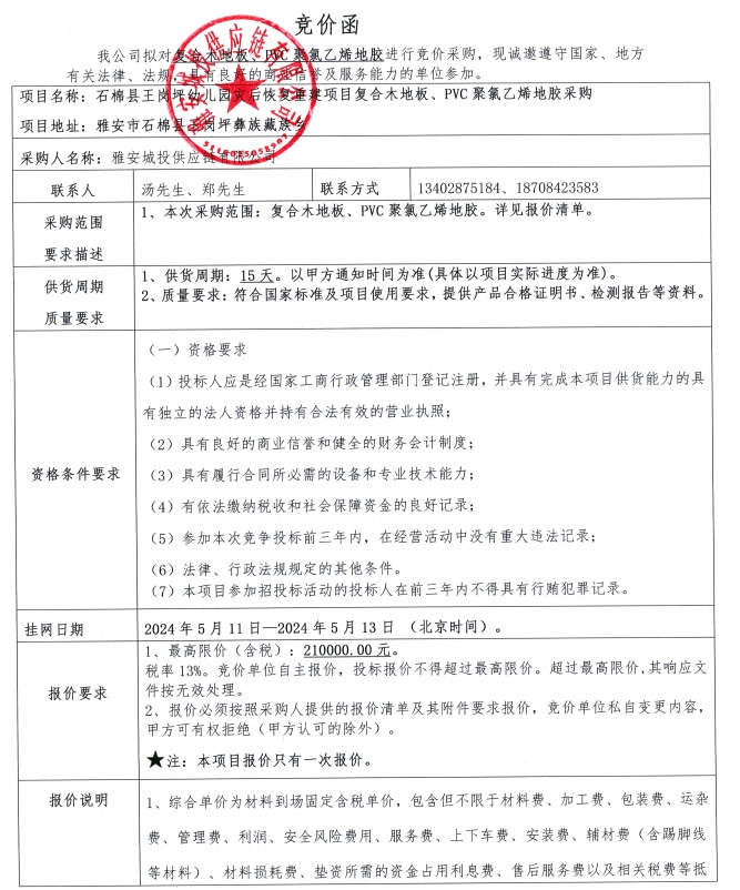 附件1:競價(jià)函--石棉縣王崗坪幼兒園災(zāi)后恢復(fù)重建項(xiàng)目復(fù)合木地板、PVC聚氯乙烯地膠采購