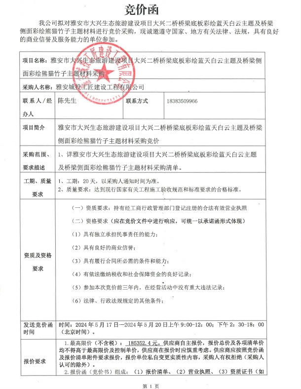 雅安市大興生態(tài)旅游建設(shè)項(xiàng)目大興二橋橋梁底板彩繪藍(lán)天白云主題及橋梁側(cè)面彩繪熊貓竹子主題材料采購競(jìng)價(jià)公告