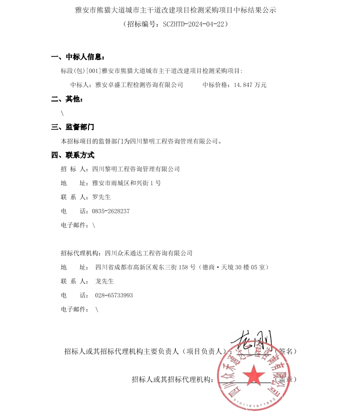 雅安市熊貓大道城市主干道改建項(xiàng)目檢測(cè)采購(gòu)項(xiàng)目中標(biāo)結(jié)果公示
