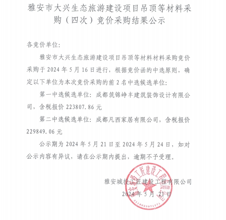 雅安市大興生態(tài)旅游建設(shè)項(xiàng)目吊頂?shù)炔牧喜少彛ㄋ拇危└?jìng)價(jià)采購結(jié)果公示