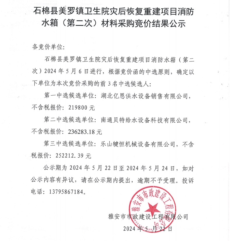 石棉縣美羅鎮(zhèn)衛(wèi)生院災后恢復重建項目消防水箱(第二次)材料采購競價結果公示
