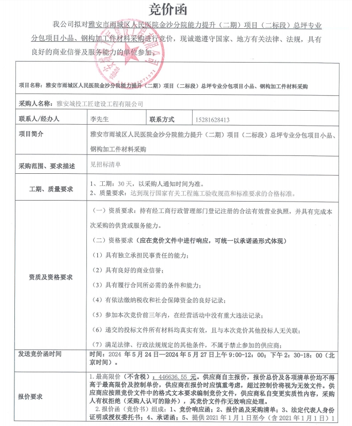 附件1:雅安市雨城區(qū)人民醫(yī)院金沙分院能力提升(二期)項(xiàng)目(二標(biāo)段)總坪專(zhuān)業(yè)分包項(xiàng)目小品、鋼構(gòu)加工件材料采購(gòu)競(jìng)價(jià)函