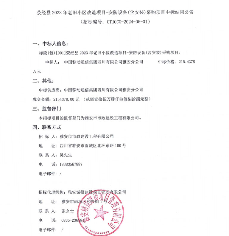 滎經(jīng)縣2023年老舊小區(qū)改造項(xiàng)目-安防設(shè)備(含安裝)采購項(xiàng)目中標(biāo)結(jié)果公告