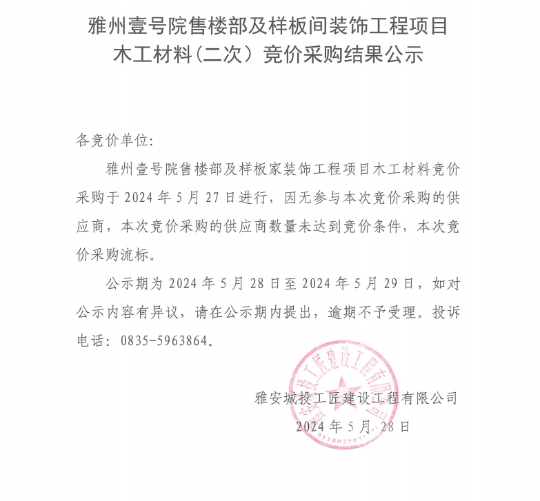 雅州壹號院售樓部及樣板間裝飾工程項(xiàng)目木工材料(二次)競價(jià)采購結(jié)果公示