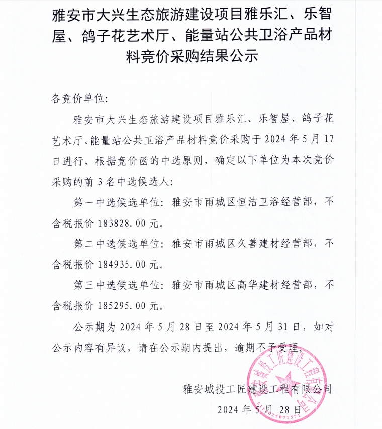 雅安市大興生態(tài)旅游建設項目雅樂匯、樂智屋、鴿子花藝術廳、能量站公共衛(wèi)浴材料競價采購結果公示