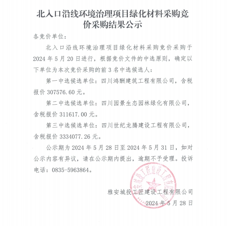 北入口沿線環(huán)境治理項(xiàng)目綠化材料采購競價(jià)采購結(jié)果公示