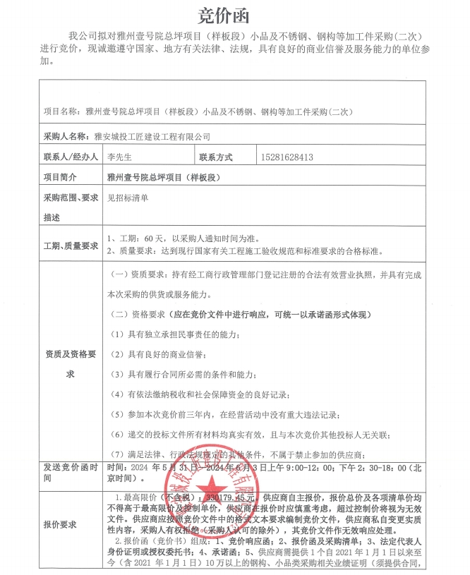 雅州壹號(hào)院總坪項(xiàng)目(樣板段)小品及不銹鋼、鋼構(gòu)等加工件的采購(gòu)競(jìng)價(jià)函