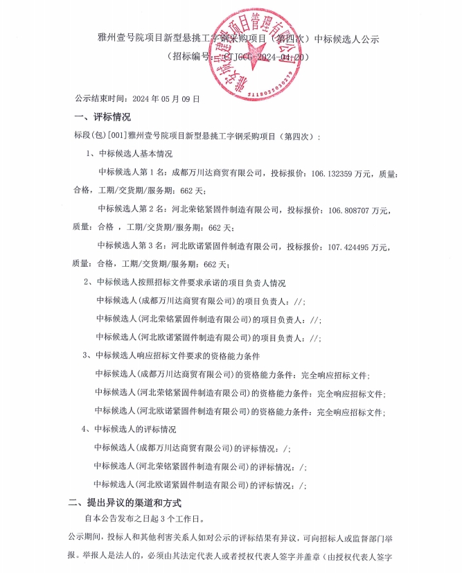 雅州壹號院項目新型懸挑工字鋼采購項目(第四次)中標(biāo)候選人公示
