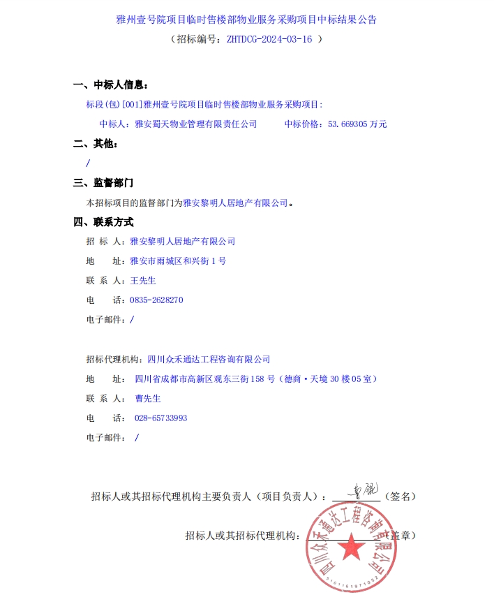 雅州壹號院項目臨時售樓部物業(yè)服務(wù)采購項目中標結(jié)果公告