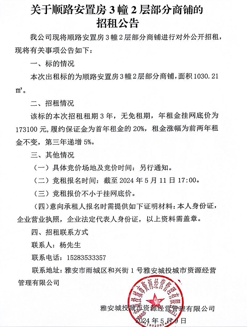關(guān)于順路安置房3幢2層部門商鋪的招租公告