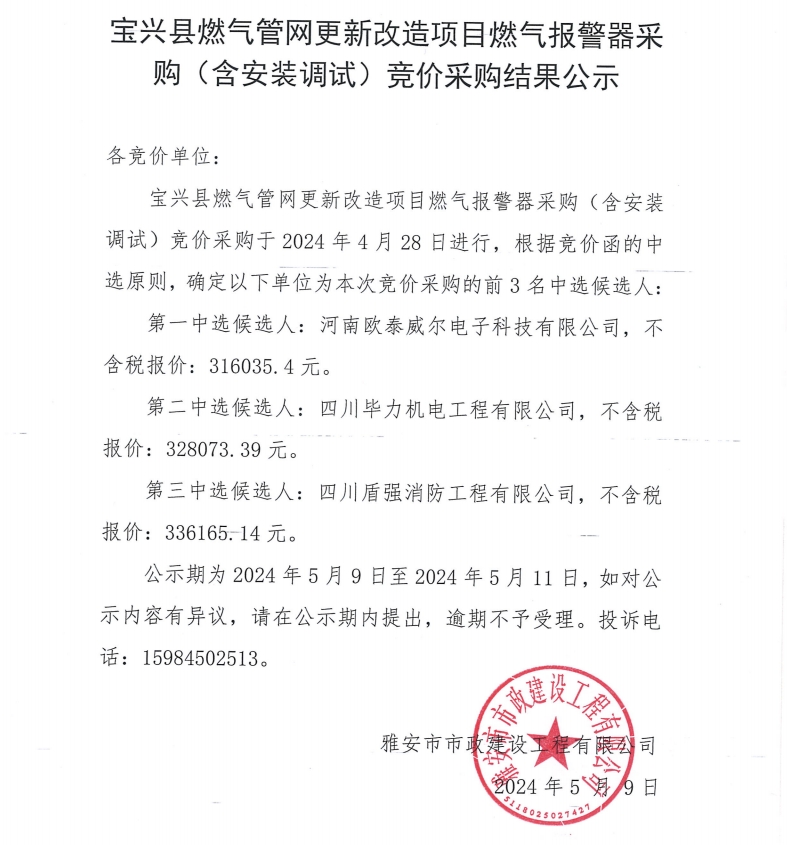寶興縣燃?xì)夤芫W(wǎng)更新改造項(xiàng)目燃?xì)鈭?bào)警器采購(含安裝調(diào)試)競(jìng)價(jià)采購結(jié)果公示