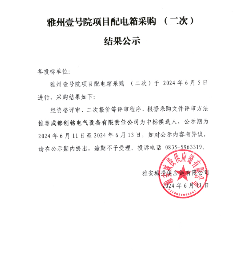 雅州壹號院項目配電箱采購(二次)結(jié)果公示