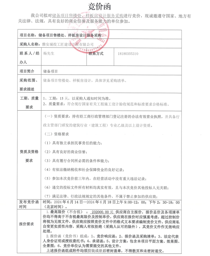 儲(chǔ)備項(xiàng)目售樓處、樣板房設(shè)計(jì)服務(wù)采購(gòu)競(jìng)價(jià)公告