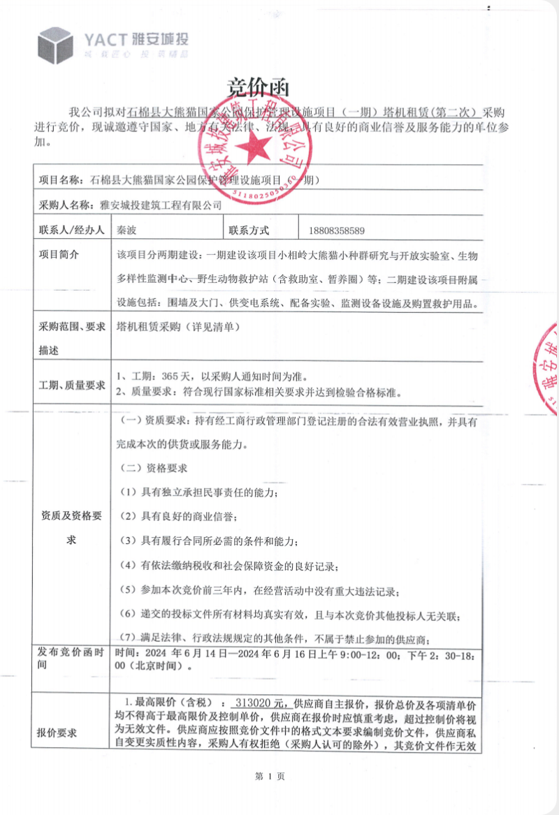 石棉縣大熊貓國家公園保護(hù)管理設(shè)施項(xiàng)目(一期)塔機(jī)租賃(第二次)競價公告