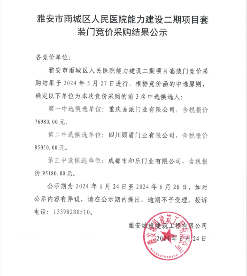 雅安市雨城區(qū)人民醫(yī)院能力建設二期項目套裝門競價采購結果公示