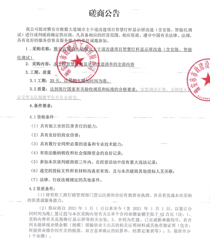 雅安市熊貓大道城市主干道改建項目智慧燈桿顯示屏改造(含安裝、智能化調(diào)試)磋商公告