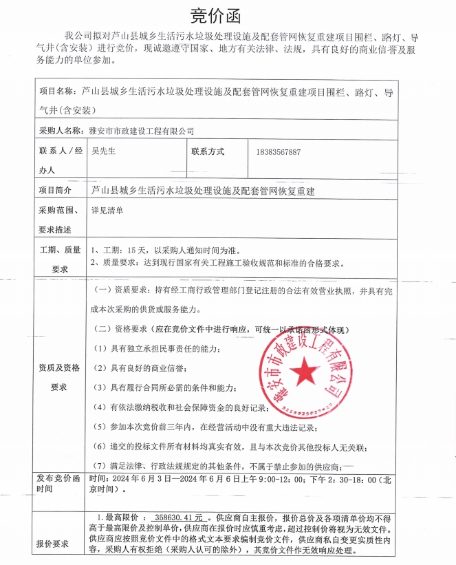 蘆山縣城鄉(xiāng)生活污水垃圾處理設(shè)施及配套管網(wǎng)恢復(fù)重建項目圍欄、路燈、導(dǎo)氣井(含安裝)采購競價公告