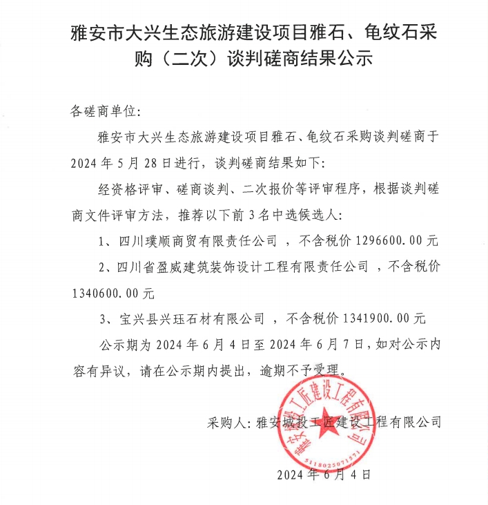 雅安市大興生態(tài)旅游建設(shè)項目雅石、龜紋石采購(二次)談判磋商結(jié)果公示