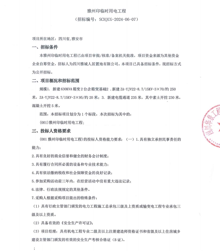 雅州印臨時用電工程招標(biāo)公告