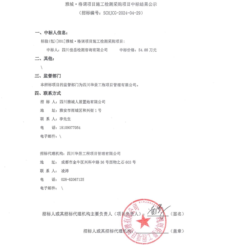雅城·格調項目施工檢測采購項目中標結果公示