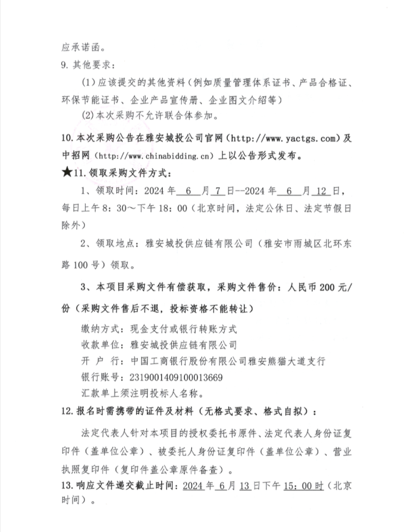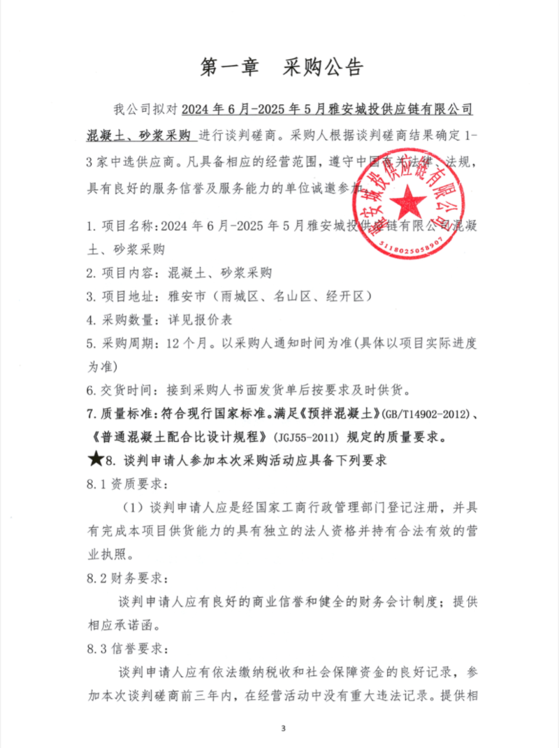 2024年6月-2025年5月雅安城投供應(yīng)鏈有限公司混凝土、砂漿采購(gòu)公告